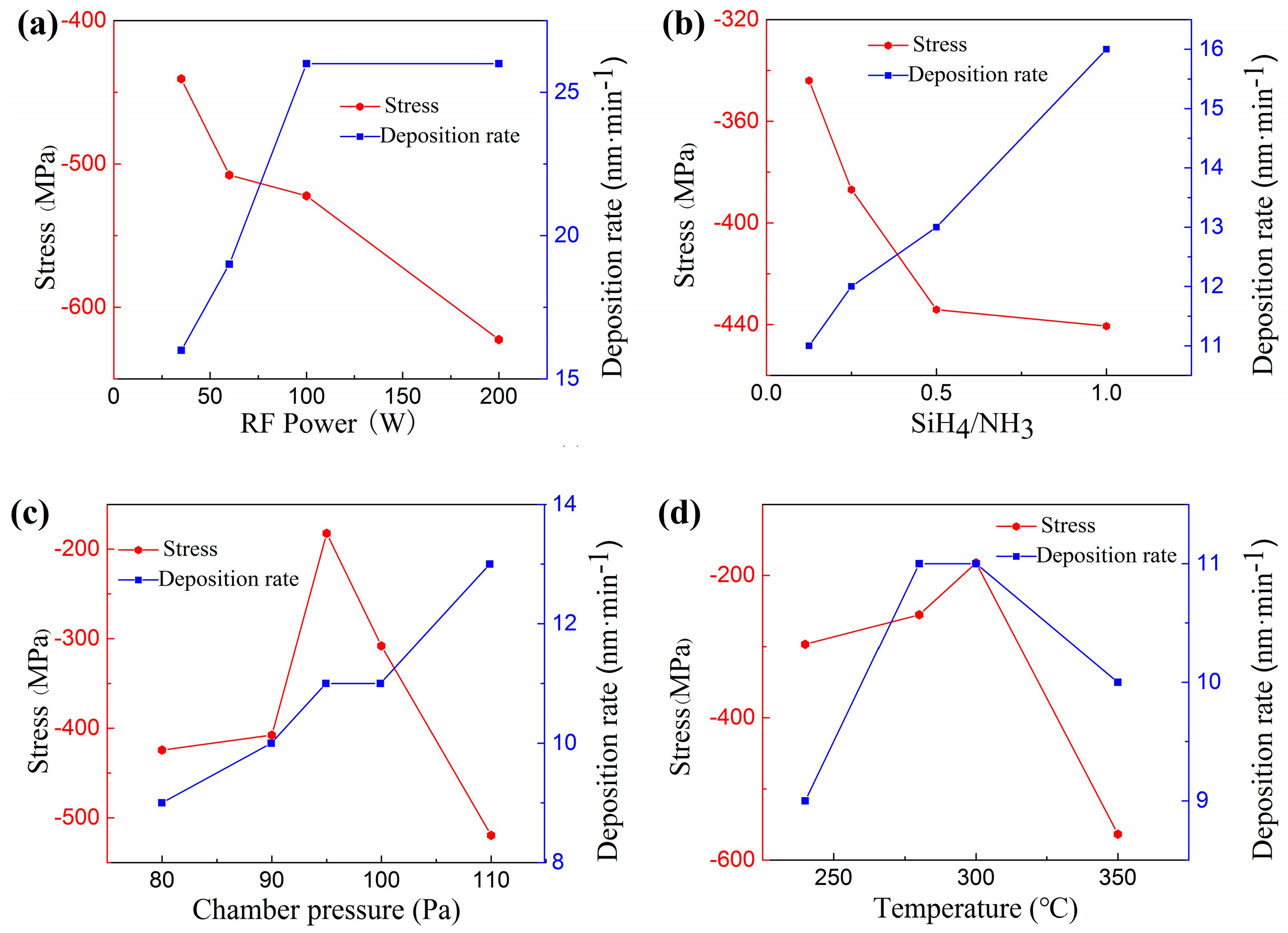 Influence of some of the key deposition parameters of the process: (a) RF power; (b) SiH4–NH3 flow ratio; (c) Chamber pressure; (d) Temperature, with the intrinsic stress level and deposition rate. The equipment used here was PECVD (PD-220, SAMCO).