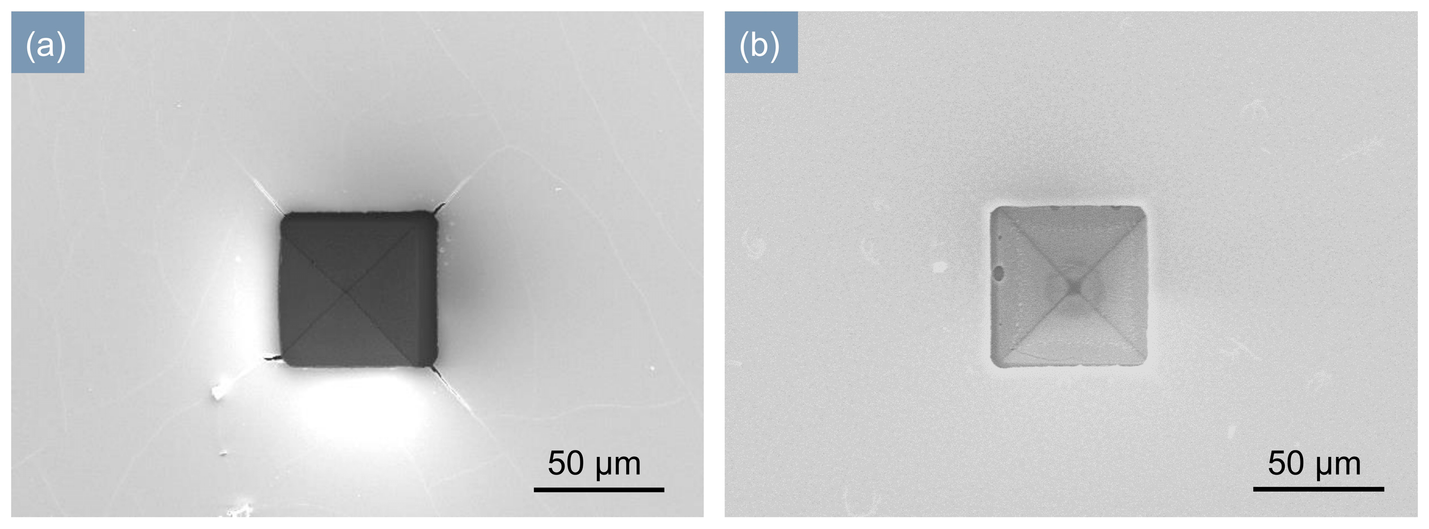 SEM images of inverted pyramid MDBD device. (a) After deposition of 2 μm-thick-SiNx by original recipe of PECVD (Plasma System100); (b) After deposition of 2 μm-thick-SiNx by optimized recipe of PECVD (PD-220, SAMCO).