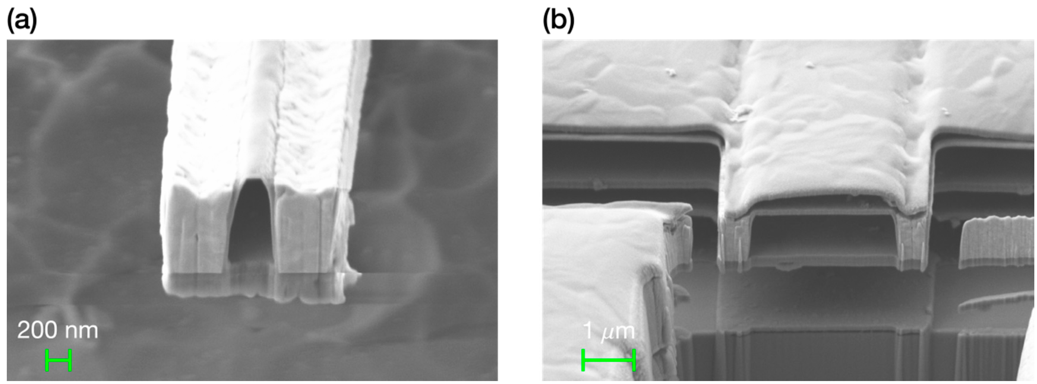 To show that the nanochannel inside the suspended bridge resonator was actually empty and the bridge released, we performed some focused ion beam (FIB) milling cuts perpendicular to the bridge main axis orientation. After each cut, we took a scanning electron microscope (SEM) image showing the interior of the nanochannel.