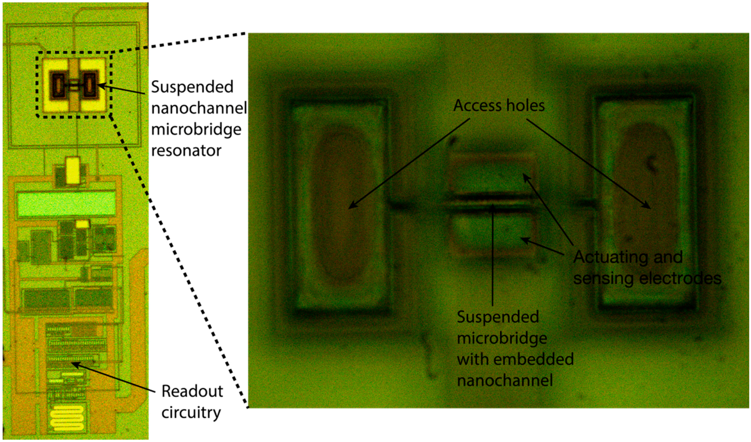 Figure 4, where we show an optical image of the fabricated suspended nanochannel microbridge resonator together with its CMOS readout circuitry. The CMOS readout circuitry employed was previously reported in reference [