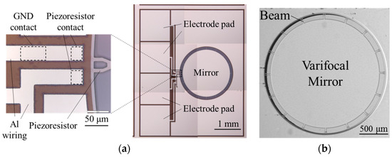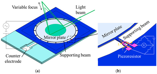 Figure 1 shows the schematic diagram of the proposed device. In Figure 1a, the device consists of the mirror plate and the counter electrode. The sixteen beams are used to suspend the mirror plate. The focal length is changed by deforming the mirror plate by electrostatic force. A piezoresistor is installed in the beam. The focal length of the varifocal mirror is obtained from the signal of the piezoresistor shown in Figure 1b, which is named “focus sensor” in this paper. The resistance of the piezoresistor changes by the strain caused by the mirror plate deformation. The strain corresponds to the focus length of the varifocal mirror.
