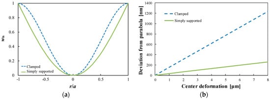 (a) Surface profiles of the circular plate at resonant frequency. (b) Comparison of the deviations from parabola between the clamped and simply supported conditions.