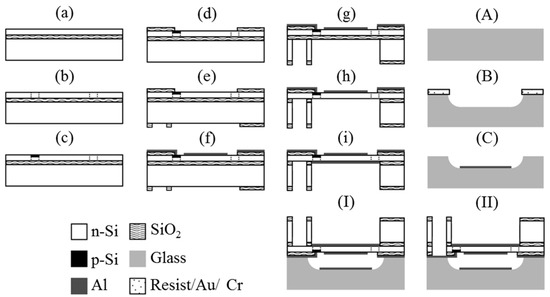 Process steps for the fabrication of the varifocal mirror. (a) SOI wafer; (b) Top Si etching; (c) B ion implantation; (d) Annealing, oxidation and buffered hydrofluoric acid (BHF) etching; (e) SiO2 deposition and BHF etching; (f) Al deposition and etching; (g) Handle Si etching; (h) BOX etching; (i) Al deposition; (A) Glass wafer; (B) HF etching with resist polymer/Au/Cr mask; (C) Al deposition and etching; (I) Anodic bonding; (II) Top Si and SiO2 etching for the electrode pad of the piezoresistor.