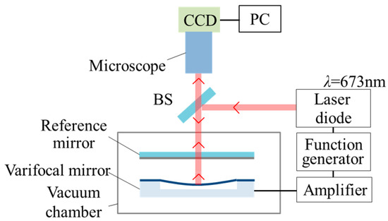Stroboscopic Fizeau interferometer for the measurement of the deformation of the varifocal mirror. CCD: Charge-coupled device camera; BS: Beam splitter; PC: Personal computer.