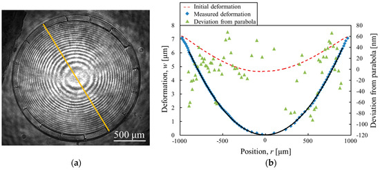 For the optical systems, the high surface precision of the varifocal mirror is required. To estimate the surface precision, the surface profile of the mirror is measured. Figure 8a shows the interference image from the stroboscopic interferometer at maximum oscillation amplitude at the voltage of 15 VDC + 30 VPP and the frequency of 9.5 kHz. The clear concentric fringes are seen in Figure 8a. In Figure 8b, the deformation of the mirror along the line shown in Figure 8a is plotted. The fitting curve is given by an equation w = 7.71 × 10−6r2 + 8.35 × 10−5r + 1.83 × 10−2, where w (in micrometers) is the deformation as a function of the radius r (in micrometers). The initial deformation of the mirror plate is also measured by a white light interferometer (MSA500, Polytec GmbH, Waldbronn, Germany) as shown in Figure 8b. The center deformation of the varifocal mirror is 7.3 μm in this condition. The deviation from the fitted parabola in the region |r| < 0.8a is also shown in Figure 8b. The deviation from the parabola is within 150 nm. Considering the He-Ne laser wavelength (λHe-Ne = 633 nm), the surface precision less than λHe-Ne/4 is obtained. From the theoretical analysis shown in Figure 3, the deviation from parabola is within 240 nm at the center deformation of 7.3 μm in the simply supported condition. The mirror surface precision of the experimental results is a little better than the theoretical results since the initial deformation may affects the dynamical surface profile.