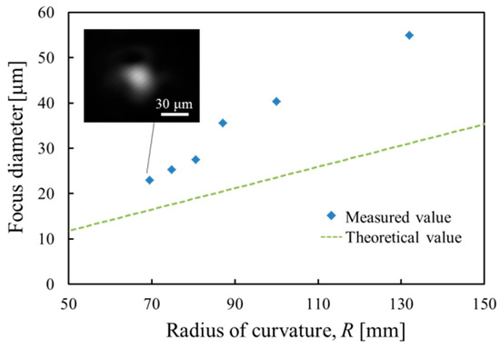 To investigate the focusing function of the varifocal mirror, the focus spot diameter measured as a function of the radius of curvature of the varifocal mirror is shown in Figure 9. The focus diameter correlates with the image resolution obtained from an instrument using the varifocal mirror. The varifocal mirror is driven at the voltage of 15 VDC + 30 VPP and the frequency of 9.5 kHz. To change the focus, the phase of the laser pulse is changed. The focus spot is obtained by using a charge-coupled device (CCD) camera (UI-2240SE, IDS Imaging Development Systems GmbH, Obersulm, Germany). The intensity distribution of the focus spot is measured using the image analysis software. The theoretical focus diameter Df is also plotted in Figure 9, which is defined by full-width-at-half-maximum intensity and expressed as follows [15],