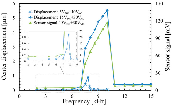 Figure 10 shows the frequency responses of the center displacement of the varifocal mirror and the piezoresistor signal voltage. The sensor signal voltage is given by the peak-to-peak value. The varifocal mirror is driven at the voltage of 15 VDC + 30 VPP and 5 VDC + 10 VPP. The Wheatstone bridge is driven at the voltage of 1.5 V. At the voltage of 5 VDC + 10 VPP, the resonant frequency is 7.8 kHz and the quality factor is 22. In our measurements, the distribution of the resonant frequency for each device is about 1 kHz in the same wafer. The time constant is decided by the focusing, which is approximately 0.1 μs. The resonant frequency is smaller than that obtained by FEM analysis (11.1 kHz). The difference between the measured and the calculated resonant frequency can be attributed to a compressive stress acting on the mirror plate. The deposited aluminum film and the anodic bonding may generate the compressive stress. At the voltage of 15 VDC + 30 VPP, the mirror amplitude increases in the frequency range between 7.5 and 10 kHz. The center displacement at a frequency of 10 kHz is 92 times larger than that in frequency range from 2 to 6 kHz. The piezoresistor signal agrees well with the center displacement of the varifocal mirror. The nonlinear phenomenon is described as follows. At a small voltage of 5 VDC + 10 VAC, although the oscillation curve is slightly asymmetric, it has a peak at 7.8 kHz and does not have the sudden transition observed at the higher voltage as shown in the inset of Figure 10. Therefore, spring hardening effect is small under the condition. Increasing the applied voltage, the frequency at the peak of the oscillation curve shifts with the increase of the amplitude. The resonant frequency at the voltage of 15 VDC + 30 VAC is larger by a factor of 6 than that at the voltage of 5 VDC + 10 VAC. However, the sudden transition from the peak at the frequency of 10 kHz to the amplitude of 0.41 μm (1/11 of the peak value) is observed at the high voltage. The sudden transition has a hysteresis when the applied voltage is decreased. This phenomenon is explained by the oscillation curve of the spring hardening effect [16]. The resonant frequency which is corresponding to the frequency at the peak increases because the stress caused by the elongation of the mirror plate increases the stiffness varifocal mirror. Therefore, the resonant frequency of the varifocal mirror depends on the displacement.