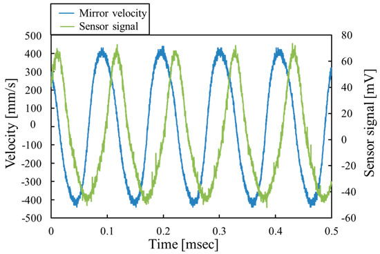 Figure 11 shows the time dependence of the mirror velocity at the center of mirror and the piezoresistor signal at the applied voltage of 15 VDC + 30 VPP and the frequency of 9.5 kHz. The velocity of the varifocal mirror is measured by the laser Doppler vibrometer (MSA500, Polytec GmbH). The surface profile of the mirror plate is concave when the piezoresistor signal voltage is negative. Figure 11 shows that the varifocal mirror deforms sinusoidally. The signal of the piezoresistor is also periodical and the frequency agrees with that of the mirror velocity. However, the piezoresistor signal varies from −45 to 65 mV and is not completely a pure sinusoidal curve. These facts may be caused by the stress σbN causing the spring hardening effect. The stress from the bending σb is calculated to be 24.7 MPa by Equation (10). The stress σbN causing the nonlinear effect is estimated to be 1.7 MPa from the resonant frequency shift as described above. The stress σbN affects the piezoresistor signal because the ratio σbN/σb is 0.07. A compressive stress σb is always applied to the piezoresistor when the mirror shape is concave. In addition, the tensile stress σbN caused by the spring hardening effect also acts on the piezoresistor, which compensates the compressive stress σb. Similarly, when mirror shape is convex, the tensile stress σb caused by the bending of mirror and the tensile stress σbN by the spring hardening effect are applied to the piezoresistor. Therefore, the amplitude of the piezoresistor signal voltage decreases when the mirror shape is concave, and, the amplitude increases when the mirror shape is convex. The above discussion can explain the waveform of the sensor signal shown in Figure 11.