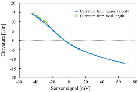 For the actual use, it is important to know the relationship between the curvature of the varifocal mirror and the piezoresistor signal voltage. The curvature as a function of the piezoresistor signal voltage is shown in Figure 12. The varifocal mirror is driven at the voltage of 15 VDC + 30 VPP and the frequency of 9.5 kHz. The curvature is measured by the two methods. One is by a focal length measurement from the spot size and the other is the measurement of the mirror velocity shown in Figure 11. The cross mark in Figure 12 shows the result of the focal length measurement and the solid curve shows the result obtained from Figure 11. In the focal length measurement, the minimum spot position is measured by changing the distance of the image sensor. In the case of the focal length measurement, the curvature is measured only from 9 to 14 m−1 due to the limitation of the measurement setup. In the case of the mirror velocity measurement, the mirror velocity is assumed to be sinusoidal and the velocity signal is integrated to obtain the displacement of the varifocal mirror at the center position. Then, the displacement is converted to the curvature assuming the deformed shape is parabolic. The curvature of the varifocal mirror obtained from piezoresistor is in the range from −12.2 to 14.4 m−1, which correspond to the focal lengths from −41 to 35 mm. The result obtained from the mirror velocity agrees with that of the focal length measurement as shown in Figure 12. In Figure 12, the curvature as a function of the piezoresistor signal voltage is not linear as described in the explanation of the waveform in Figure 11. The nonlinear dependence can be compensated by software when the varifocal mirror is used in application systems. For actual use of the varifocal mirror, the focal length is obtained by the curvature as a function of the piezoresistor signal voltage as shown in Figure 12. Since the focal length is the inverse of the curvature, the piezoresistor signal can be used as a signal of the focus sensor. From Figure 12, in the signal region higher than −5 mV, the curvature is negative and the mirror is convex. In this region, the parallel beam is reflected by the mirror and diverges from the mirror. At the sensor voltage of −5 mV, the beam is reflected as it is since the curvature is zero. At the sensor voltage of 65 mV, the laser beam diverges from a virtual image focus at a focal length of −41 mm. In the sensor signal region lower than −5 mV, the curvature is positive and mirror is concave. The parallel laser beam converges on a real focus. At the sensor voltage of −45 mV, the curvature is 14.4 m−1, which is equal to the real focal length of 35 mm.