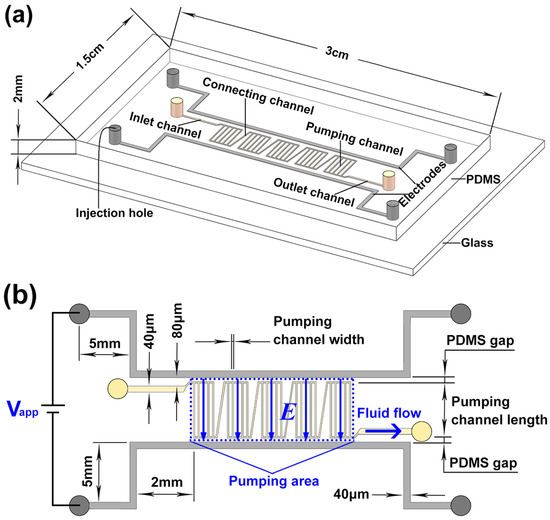 As shown in Figure 1b, when a voltage is applied, a parallel electric field will be induced in the pumping area (within the blue dashed box), generating EOFs along the pumping channels. In this EOF pump, the two electrode channels are extended by 2 mm (10 times of pumping channel length) from the edge of pumping area. An advantage of this extension design is that it can make the distribution of electric field inside the pumping area more uniform, which will help generate high-velocity EOFs in these pumping channels. To show the design guidance for the EOF pump, parametric studies were performed. The PDMS gap (20 μm, 30 μm, 40 μm, and 50 μm), pumping channel length (100 μm, 200 μm, and 500 μm) and width (20 μm, 30 μm, and 40 μm), pump stage number (single-stage, five-stage, and 10-stage) are fully discussed. The PDMS gap between adjacent pumping channels has the same size as the pumping channel width. The connecting channel has the same width, but is 1.4 times long as the pumping channel. The width and length of the inlet/outlet channel are 40 μm and 2 mm, respectively. The PDMS gap between the inlet/outlet channel and the electrode channel is 80 μm. The electrode channel is 40 μm wide. All channels are 20 μm high.