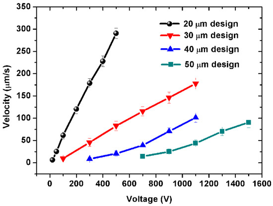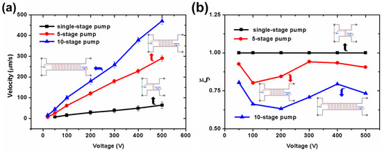 Figure 5 shows the pumping velocity in the outlet channel as a function of driving voltage with different pump stage numbers. Single-stage, five-stage, and 10-stage designs are performed in this work. The PDMS gap is 20 μm. The pumping channels are 20 μm wide and 200 μm long. It can be seen clearly from Figure 5a that the pumping velocity will increase with the increment of the stage number of the pump. When a voltage of 20 V is applied, the five-stage design and the 10-stage design can start to drive water flows of 6.26 and 7.24 μm/s, respectively. However, the single-stage design only begins to drive the flow when the voltage reaches as high as 50 V. When a high voltage of 500 V is applied, the five-stage design and the 10-stage design can, respectively, drive 3.52 times and 6.33 times higher pumping flow velocity than the single-stage design. In other words, adding the stage number of the pump can help to effectively improve the pump energy, generating higher pumping flow velocity.