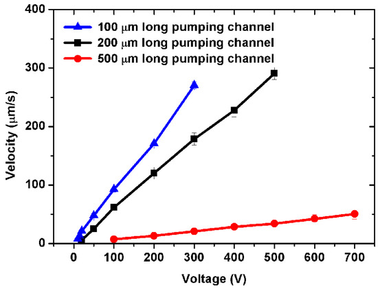 Experimental results of pumping velocity as a function of driving voltage with different pumping channel length in a five-stage pump. The PDMS gap is 20 μm. The pumping and connecting channels are 20 μm wide. The connecting channels are 1.4 times as long as the pumping channels. The inlet and outlet channels are 2 mm long, 40 μm wide. All channels are 20 μm high.