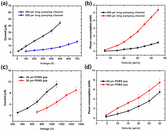 Experimental results of electric current through PDMS gap in a five-stage pump. (a) Current as a function of applied voltage with different pumping channel length; (b) Power consumption as a function of velocity with different pumping channel lengths. The pumping and connecting channels are all 20 μm wide. The connecting channels are 1.4 times as long as the pumping channels. The PDMS gap between electrode and pumping channels is 20 μm. The PDMS gap between adjacent two pumping channels is 20 μm. The inlet and outlet channels are 2 mm long, 40 μm wide. All channels are 20-μm high; (c) Current as a function of applied voltage with different PDMS gaps between the electrode and pumping channels; (d) Power consumption as a function of velocity with different PDMS gaps between electrode and pumping channels. The length and width of pumping channels are 200 μm, 40 μm, respectively. The connecting channels are 280 μm long, 40 μm wide. The inlet and outlet channels are 2 mm long, 40 μm wide. All channels are 20 μm high. The PDMS gap between two adjacent pumping channels is equal to the width of the pumping channel.
