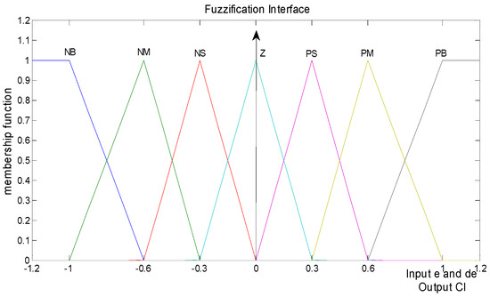 The main functions of PID controllers are improving the dynamic response and reducing or eliminating the steady state errors. The improvement of the fuzzy-PID controller by incorporating a fast learning PID controller gains with fuzzy control parameters, yielding a high-quality solution [15], is chosen in this article. As shown in Figure 2, the tracking error e(t) and the differential tracking error de(t) after modifying the triangle membership function in segments (0, 0.3, 0.6, and 1) are the inputs of the fuzzy inference system. The two inputs e(t) and de(t), and the output CI are formal triangular membership functions.
