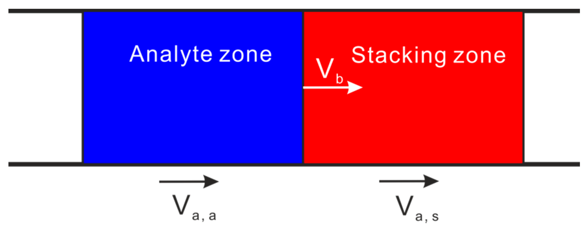 Schematics of the stacking mechanism via manipulation of the net velocities of analytes. The analyte in the analyte (stacking) zone moves with a velocity of Va,a (Va,s), and the boundary between analyte zone and stacking zone moves with a velocity of Vb.