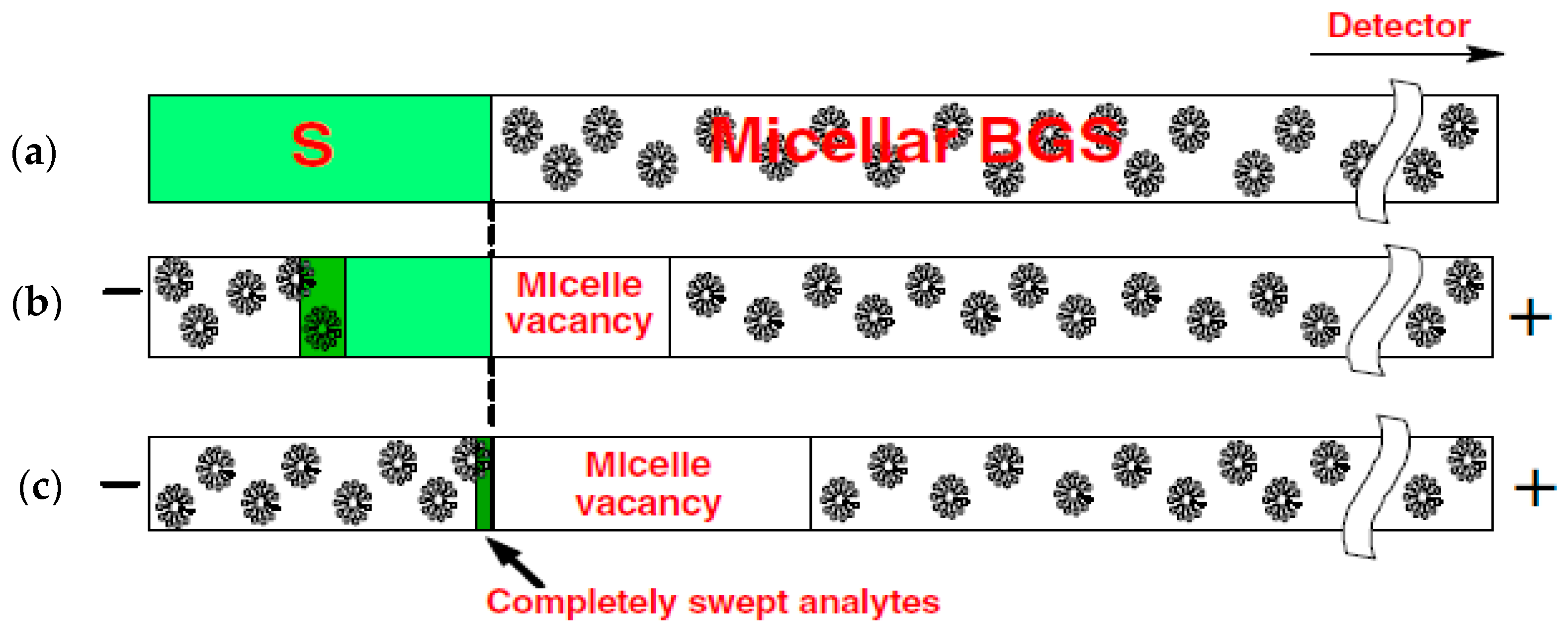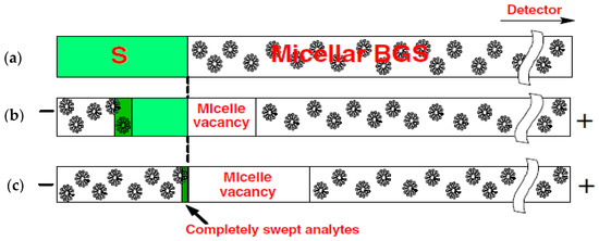 Sweeping was initially developed for concentrating neutral hydrophobic analytes through picking and accumulation of analyte molecules in their pseudo-stationary phase (PSP) that penetrates the sample zone. It was first described in electrokinetic chromatography using a charged pseudo-stationary phase (i.e., micelle) [15]. In combination with stacking by ion selective injection, sweeping has also been applied to charged hydrophobic analytes [16,17]. To elucidate the sweep mechanism, an example of neutral analytes with a negatively charged PSP is shown in Figure 2. Micelles are chosen as the PSP and are suspended in the background solution (BGS). The conductivities of liquids are similar, and thus a homogenous electric field is expected in the capillary. Electroosmotic flow is neglected here, and neutral analytes have to be incorporated into charged micelles for transportation. Under such circumstances, neutral analytes are transported to the detector by micelle electrophoresis.