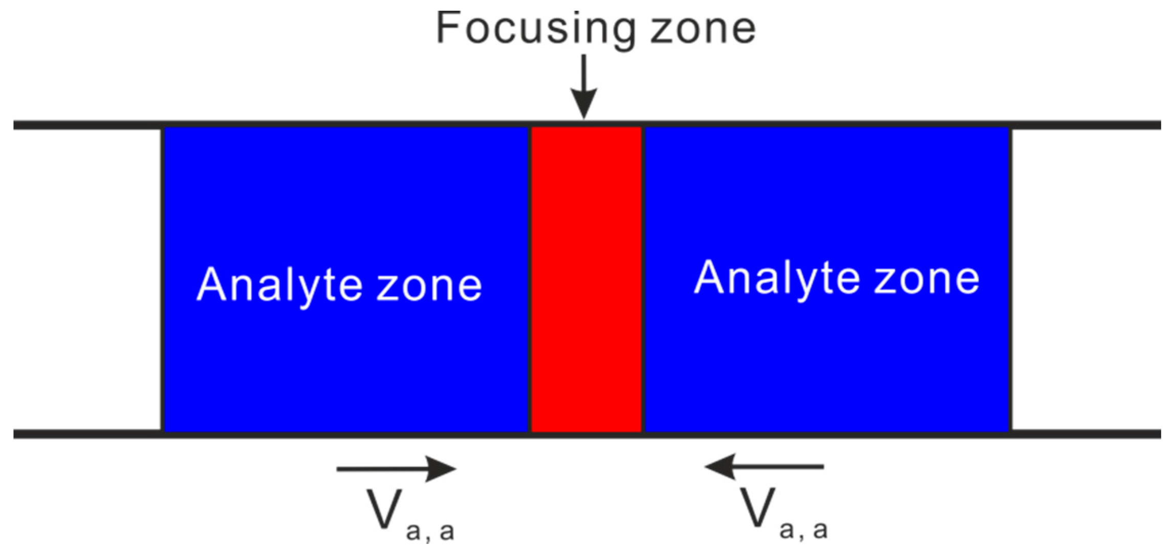 The central idea of gradient focusing methods is explained in Figure 4. The analyte inside the two analyte zones moves with a velocity of Va,a towards the focusing zone which is stationary, and gradually the analyte concentration inside the focusing zone is enhanced. To create a variation of analyte velocity in Figure 4 is critical for the success of analyte focusing, and usually various field gradients (such as pH gradient, electric field gradient and temperature gradient) are utilized for such purpose. Gradient focusing is different from stacking, although they both achieve an increase in analyte concentration by varying analyte axial velocity. The main difference between the two is the ways in which analytes are transported to the concentration region [38]. In the stacking, analytes are concentrated at a boundary because of reducing the magnitude of the analyte velocity across the boundary but no change of analyte velocity direction. Therefore, the extent of concentration enhancement is limited by such velocity reduction. However, for the focusing techniques, analytes are concentrated at a focusing point since analytes migrate to this point from both directions due to a change in direction of the analyte velocity. As a result, the concentration process continues at the focusing point provided that the focusing field is present or until the sample analyte is completely exhausted. The concentration enhancement in focusing techniques is determined by the velocity at which analytes migrate to the focusing zone and the duration for applying the focusing field.