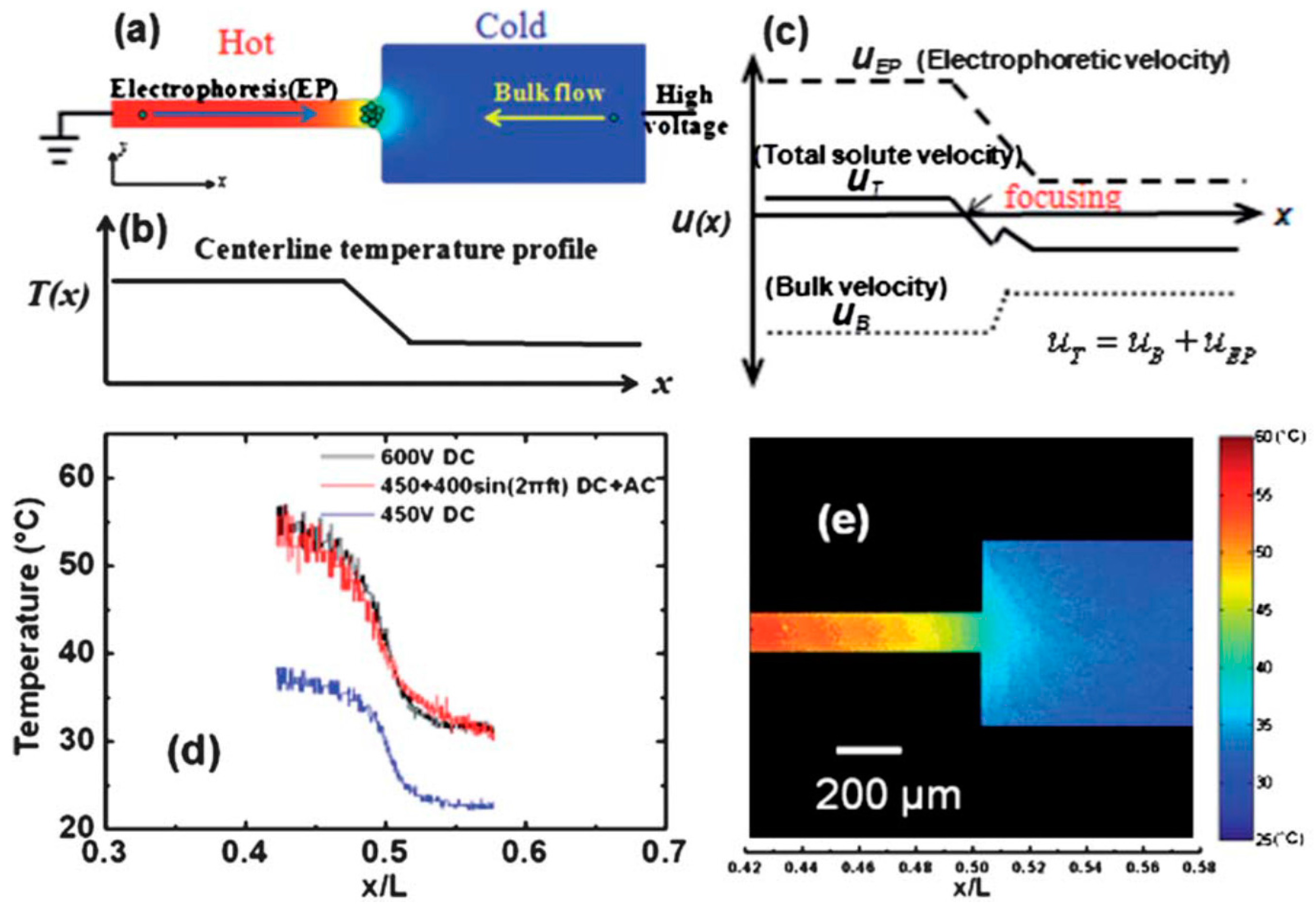 Principle of Joule heating induced TGF in a microfluidic sudden expansion under a combined AC/DC electric field. (a) Joule heating in the microfluidic expansion produces a temperature gradient around the junction region connecting narrow and wide channels; (b) temperature distribution along the centerline of microchannel (axial direction); (c) velocity profiles of sample solute along the centerline of microchannel due to pure electrophoresis (dashed line), pure bulk flow (dotted line), a combination of electrophoresis and bulk flow (solid line); (d) temperature distributions along the centerline of a 10 mm long polydimethylsiloxane (PDMS) microchannel for three different applied voltages: 450 V DC, 450 V DC + 400 sin(2πft) V AC and 600 V DC, measured with the rhodamine B thermometry; (e) temperature contour in the microfluidic expansion for an applied voltage of 450 V DC + 400 sin(2pft) V AC, measured in 180 mM Tris–borate buffer solution. Reprint from Ref. [82].