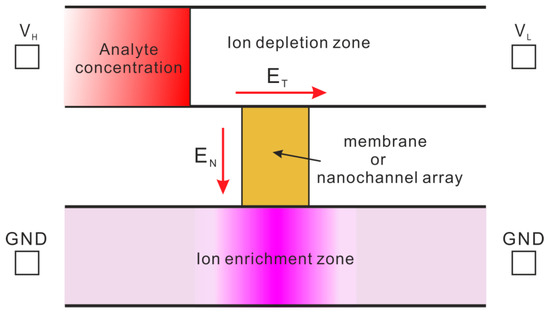 Electrokinetic trapping (EKT) is a result of ion concentration polarization which is a universal phenomenon near ion selective membranes or microchannel-nanochannel junctions. Figure 7 illustrates a typical EKT sample concentration system by ion concentration polarization. The system consists of two microchannels that are connected by an ion selective membrane or nanochannel array. During operation, two ends of the lower channel are electrically grounded (GND), and two ends of the higher channel are provided with voltages, VH and VL, and VH is maintained to be larger than VL. Then, the electric fields inside the upper microchannel and the membrane, ET and EN, are induced, as is shown in the figure. Under the effect of EN, only ions with polarity that is opposite to the polarity of membrane surface charge can penetrate through the membrane (In most cases, the membrane has negative surface charges, so only cations can pass through the membrane). Such selective transport of ions through membrane at equilibrium leads to the formation of an ion enrichment zone inside the lower microchannel while an ion depletion zone in the higher microchannel. This is characteristic of ion concentration polarization [85,86]. Since ion depletion zone allows no existence of charged species, the left boundary of ion depletion zone must prevent the passage of any charged species from the analyte zone to ion depletion zone. Therefore, the charged analyte from analyte zone would be trapped near the left boundary of the ion depletion zone (the unshaded zone inside the higher microchannel), and gradually the concentration of charged analyte is enhanced [85,87]. The stability of EKT is dependent on various factors such as pore size, charge density of the nanopores membrane, and counteracting flow which one has to take into account for fabricating a viable concentration device.