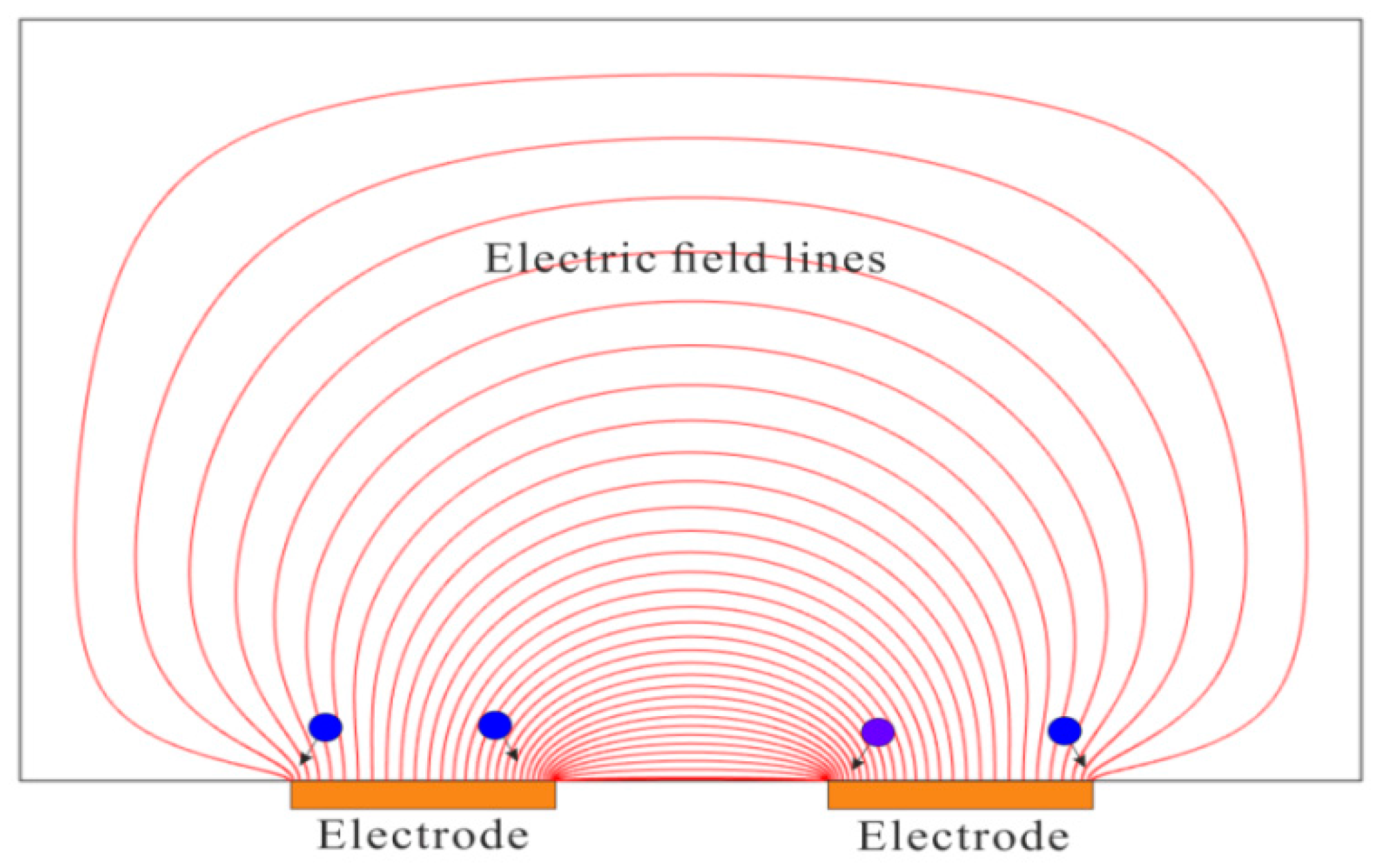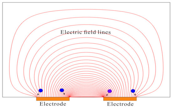 Schematics of dielectrophoretic (DEP) trapping of particles over edges of coplanar electrodes. The density of electric field lines determines the electric field strength, and it is clear that the electric field strength is the highest over the edges of electrodes. Under the effect of positive DEP force, particles would move from the region of low electric field strength (center of electrode) to the region of high electric field strength (edges of electrode).