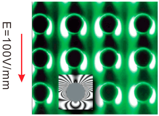 The creation of nonuniform electric fields is essential for DEPT. Most studies in the literature, such as those reviewed above, create nonuniform electric fields by specific arrangement of electrodes. Such method is most widely used, but usually requires complicated electrode design and also faces the problem of electrode fouling and degradation. An alternative way of producing nonuniform electric fields is by embedded obstacles such as a specifically arranged array of insulators. Insulators suffer much less from fouling and degradation. In addition, insulators made of polymer-based materials can be mass produced with standard microfabrication processes, giving rise to cheap and large-volume devices. Such concept of insulator-based DEPT was first presented by Cummings and Singh [112] who fabricated a microfluidic device with an array of insulating pillars in a microchannel. One electrode in the microchannel inlet reservoir and the other electrode in the microchannel outlet reservoir are supplied with a DC voltage to set up an electric field along the microchannel. Then nonuniform electric field strength is induced due to the geometric confinement between insulating pillars. The DEPT of 200 nm fluorescent polystyrene particles were successfully demonstrated, as is shown in Figure 9. Chou et al. [113] demonstrated insulator-based DEPT of DNA molecules using AC electric fields. Lapizco-Encinas et al. [114] investigated the selective DEPT of polystyrene particles, live E. coli, and dead E. coli in an array of insulating micropillars under DC electric fields. The same group reported the selective DEPT of four different types of live bacterial cells, including the Gram-negative Escherichia coli and the Gram-positive Bacillus subtilis, Bacillus cereus and Bacillus megaterium [115]. Mela et al. [116] elaborated the effect of zeta potential of device material on insulator-based DEPT, and found that Zeonor 1060R substrates require lower trapping voltage thresholds as compared to glass substrates. This is due to the fact that the Zeonor substrate has a zeta potential that is lower than the glass substrate under a same physicochemical condition.
