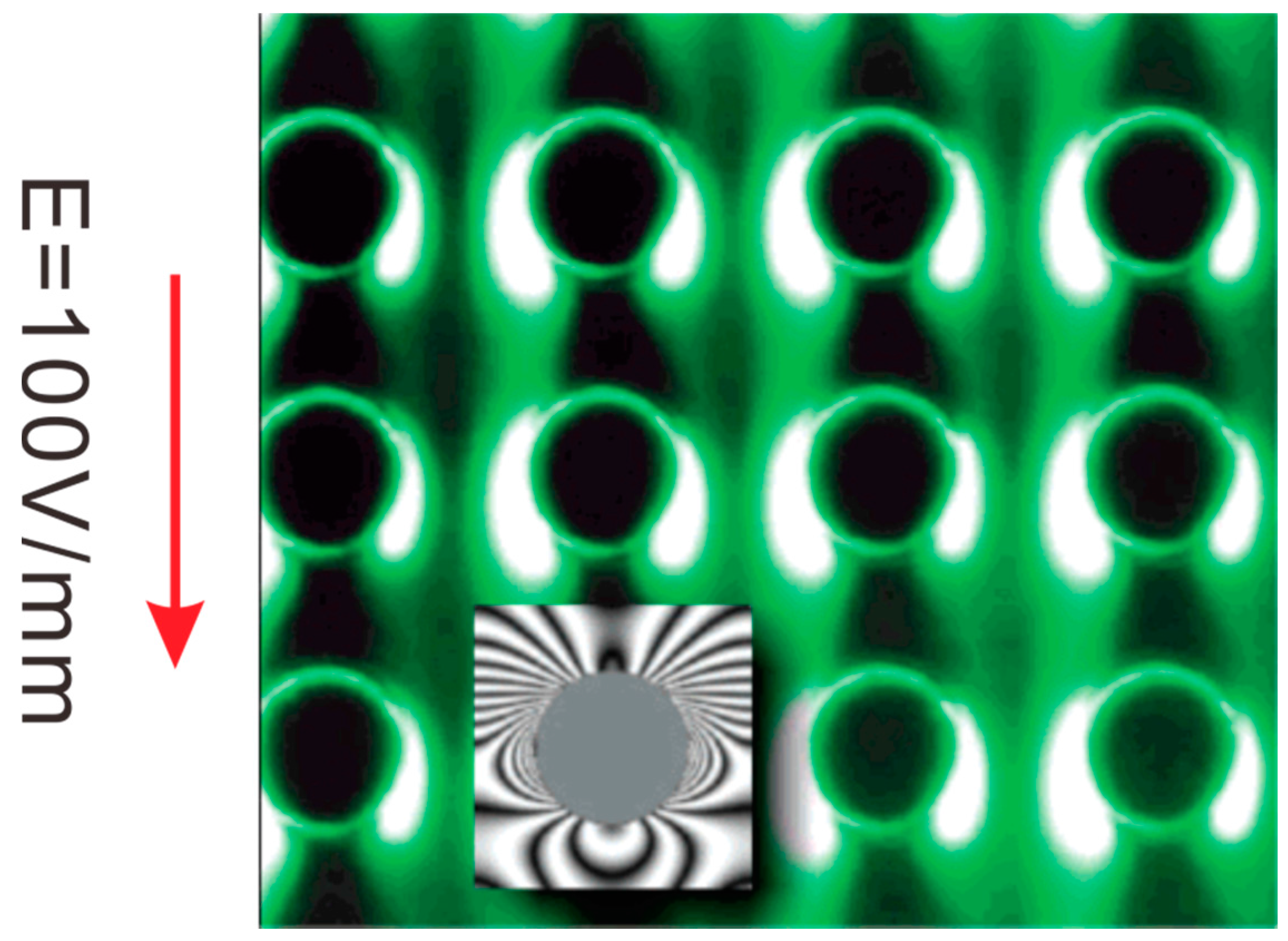 Dielectrophoretic trapping (DEPT) of fluorescent particles by an array of insulating pillars. The pillars are 33 μm in diameter and with a center-to-center separation of 63 μm. The inset picture shows the isopotential lines around one pillar from numerical simulation. Dielectrophoretic traps are defined by regions with isopotential lines bending back onto a pillar surface. Reprint from [112].