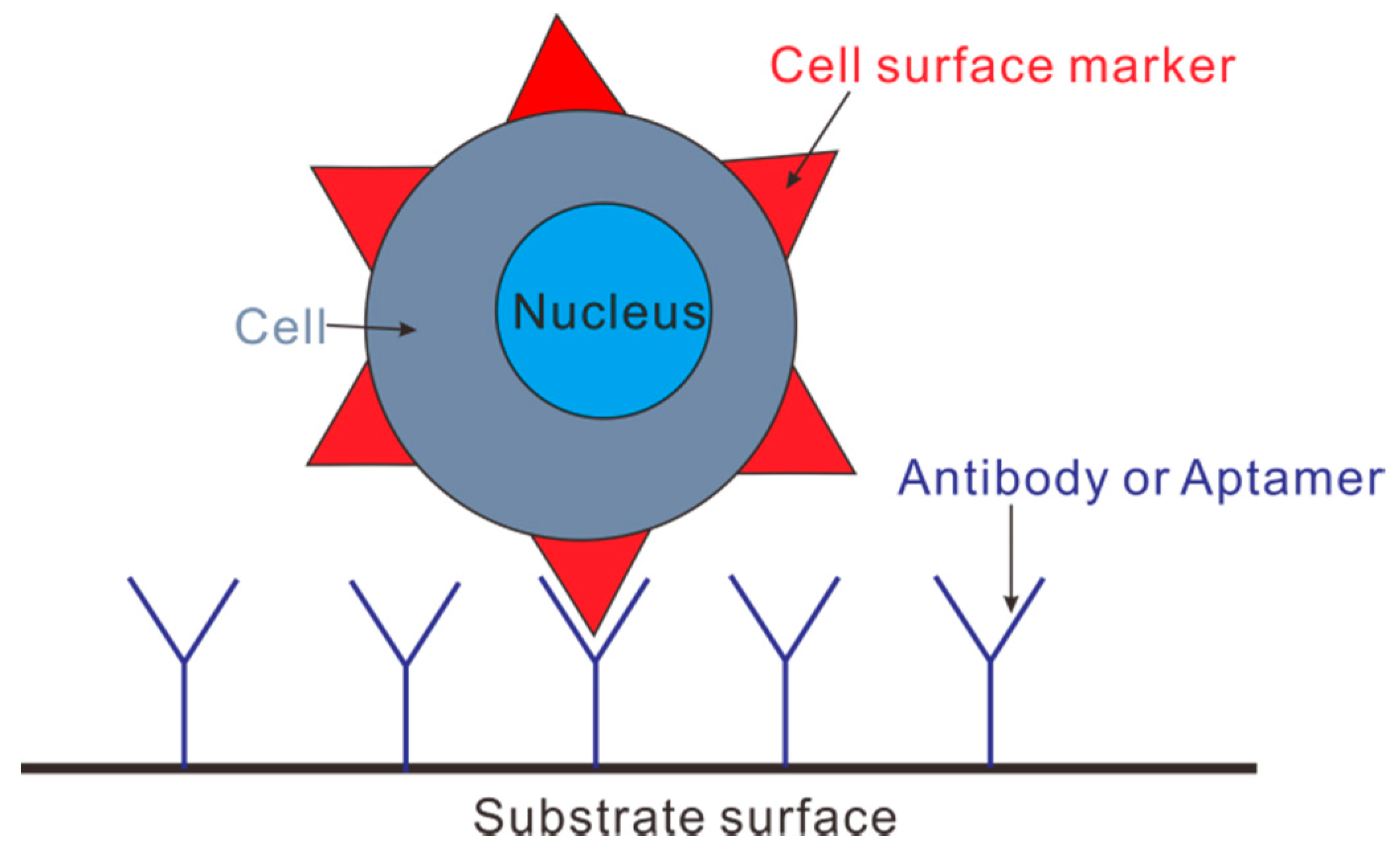 Schematic principle of immunocapture of a circulation tumor cell (CTC). An antibody or aptamer chemically immobilized on the substrate surface can be specifically linked with cell surface markers extruding from the cell membrane.