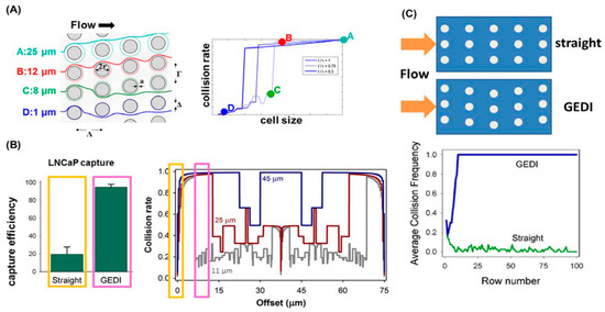 Some recent efforts have been made to improve the performance of classic immunocapture. In conjunction with dielectrophoresis, immunocapture was shown to be able to maximize the capture of target rare cells, while minimizing the capture of contaminating cells [104,145,146]. Another important development by Kirby and his colleagues is the so-called geometrically enhanced differential immunocapture (GEDI) microfluidic devices that capture rare cells from blood or cell suspensions [125,131,147,148]. Figure 11 decribes the principle of the GEDI capture in detail. GEDI combines the cancer-specific antibody immunocapture with micropillar array to enhance the probability of the collision of larger cells (e.g., CTCs) with the substrate, while minimize the probability of the collision of smaller contaminating cells (e.g., leukocytes) with the substrate. The GEDI platform has been successfully used by the authors for concentrating pancreatic cancer cells [131], prostate cancer cells [148,149], breast and gastric cancer cells [150]. Very recently, Sarioglu et al. [151] developed a microfluidic device (the cluster-chip) to capture CTC clusters instead of single CTCs from unpretreated blood without the need of tumor-specific markers. CTC clusters were physically captured by geometric obstructions with low-shear liquid flow. For 30 to 40 percent of patients with metastatic breast or prostate cancer or with melanoma, the device was able to identify CTC clusters. The ability to capture CTC clusters is much needed for subsequent characterization of their biological properties and roles in metastasis.