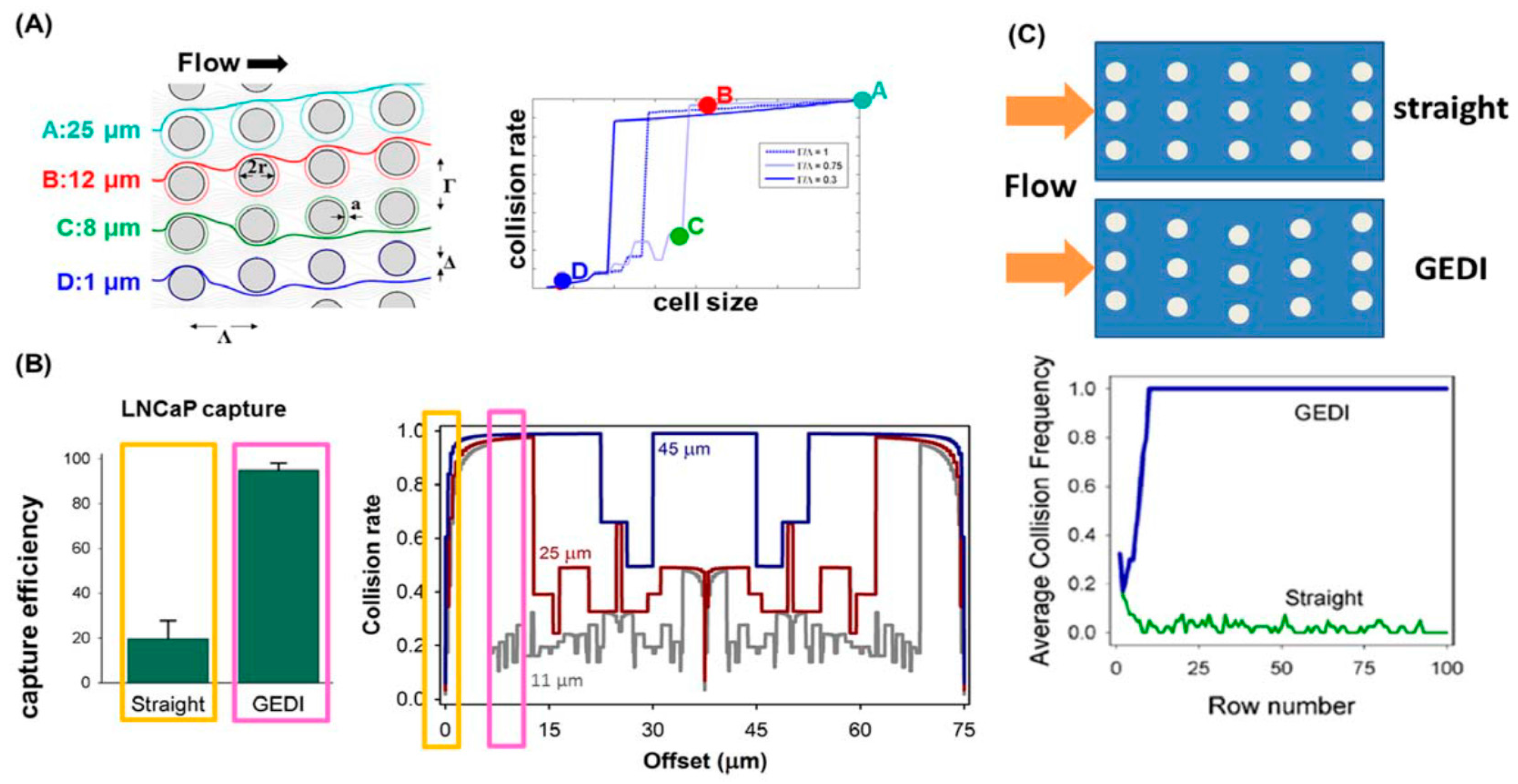 A typical geometrically enhanced differential immunocapture (GEDI) microfluidic device for cell capture. (A) Left: Top view of micropillar array. Δ is pillar offset; Λ is pillar separation in the direction of bulk flow; Γ is the pillar separation in the direction perpendicular to bulk flow; 2r is the pillar diameter. Light gray lines represent the fluid flow streamlines. Color lines denote trajectories of cells of various sizes. Right: The cell-wall collision rate varies with the cell size and the offset parameter of the array; GEDI prefers size-dependent collision rates introduced by a nonzero offset parameter. The solid lines are the results predicted for the flow geometry at left; four colored dots are corresponding results of four specific cell sizes. The dotted and dashed lines are results predicted for other two offset parameters; (B) the comparison of measured LNCaP capture efficiency on J591-functionalized devices for GEDI (7-mm offset) and straight (no offset) geometries (both geometries have the same surface-area-to-volume ratio). Right figure shows the simulated collision rates in these geometries. Straight arrays or arrays with small offsets (yellow boxes) induce low capture efficiency (left) and size independence (right). In contrast, arrays with large offsets (magenta boxes) induce high capture efficiency (left) and size dependence (right); (C) the collision frequency in straight (GEDI) array decreases (increases) as the sample flows through the device. Reprint from Ref. [148].