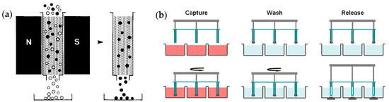 Two typical systems of magnetic beads assisted trapping and releasing of cells. (a) Column-based system. Left: Under the effect of external magnetic field, cells labeled with superparamagnetic nanobeads (black dots) are trapped on the matrix of column, while unlabeled cells (white dots) can go through the column. Right: The trapped cells can be released as soon as the magnetic field is removed. “N” and “S” denotes the north pole and south pole of the magnet, respectively; (b) MagSweeper system. Blood samples in the capture wells are labeled with magnetic nanobeads. The magnetic rods covered with a thin layer of plastics sweep through the wells in concentric circular loops to magnetically attract target cells labelled with nanobeads. Loosely attracted unwanted cells are washed off from the magnetic rods with them moving in circular loops. Finally, the magnetic rods are immersed into a new buffer solution and disengage from the plastic covers. Cells labeled with magnetic nanobeads are released under the effect of magnetic fields setup by magnets located under the wells. Figure (a) is reprinted from [152], Figure (b) is reprinted from [154].