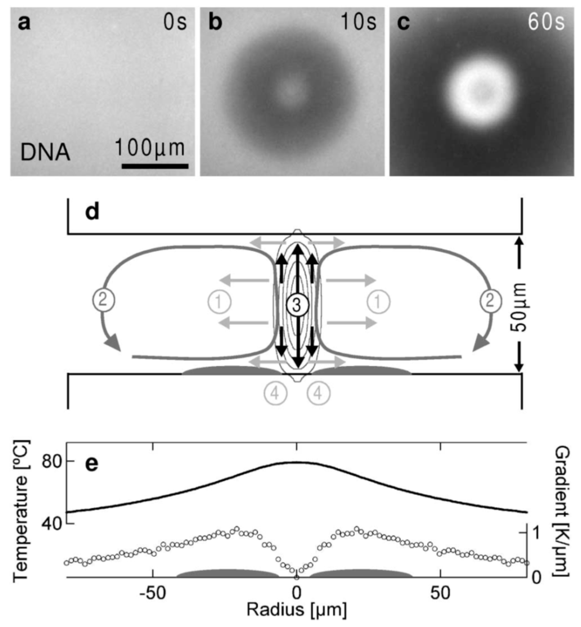 Mechanism of the thermophoretic trapping (TPT) technique for concentrating DNA. (a) Initial DNA distribution without any heating; (b) fast DNA depletion due to thermophoresis; (c) DNA concentration due to the combined effect of thermophoresis and thermal convection; (d) the TPT is a synergistic effect of lateral thermophoresis (1)/(4), axial thermophoresis (3) and convection (2); (e) the measured lateral temperature distribution around the heating spot. Reprint from Ref. [162].