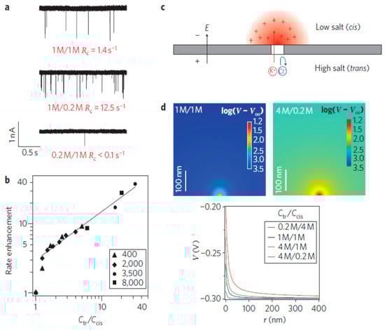 - Wanunu, M.; Morrison, W.; Rabin, Y.; Grosberg, A.Y.; Meller, A. Electrostatic focusing of unlabelled DNA into nanoscale pores using a salt gradient. Nat. Nano 2010, 5, 160–165. [Google Scholar] [CrossRef] [PubMed]