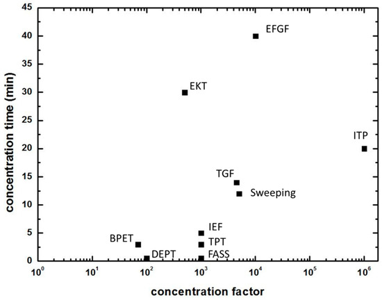 Isoelectric focusing (IEF), also known as electrofocusing, is commonly used for concentrating and separating proteins at their respective isoelectric points in the presence of a pH gradient [39,40]. When protein molecules are subject to a pH gradient, they acquire different electric charge. At a specific value of pH (so called isoelectric point), the proteins are unchanged, while the proteins below and above such specific pH value are oppositely charged. Under the effect of an electric field, proteins move electrophoretically towards the isoelectric point and eventually stop at this point. Gradually, protein molecules become more concentrated at the isoelectric point. Successful implementation of IEF relies on the generation of stable pH gradients [41]. However, from an application viewpoint, IEF is limited due to the restriction of sample analytes with an accessible isoelectric point along a pH gradient [42]. In addition, the low solubility of most proteins at their isoelectric points highly degrade concentration enhancement by IEF [43].