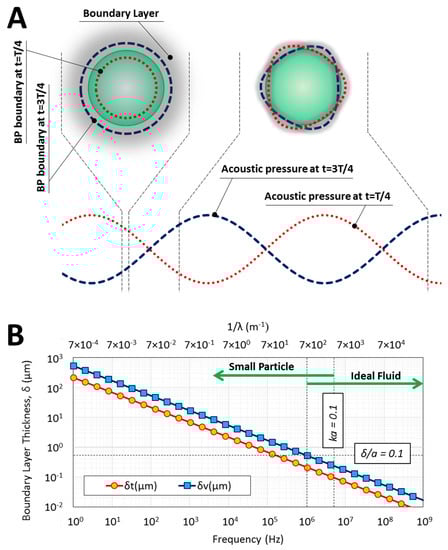 where , , , and are BP volume, isentropic compressibility and density of the fluid, and incident pressure and velocity fields, respectively. The expressions for the monopole and dipole scattering coefficients, and are given for special cases of particles in ideal [22,23], viscous [26] and thermoviscous fluids [25]. Although Equation (5) can be recovered from Equation (4) after applying the limiting assumption of small particle, there is also the possibility to use Equation (4) directly in finite element model (FEM) to obtain the ARF for an arbitrary BP size. At high frequencies of acoustic waves, the BP experiences complex harmonic behavior and introduces its size as a significant factor (Figure 1A). On the other hand, the effect of boundary layers compared to the BP size is negligible due to their infinitesimal thickness (Figure 1B). Figure S1 further demonstrates that given the close material properties of BPs and water (as fluid), the ideal fluid assumption is reliable in high frequencies of acoustic waves. As a result, the ideal fluid assumption is assumed valid in this study to evaluate the ARF exerted on BPs in high frequencies, therefore the time-averaged second order fluid stress is defined as Equation (6) [36].