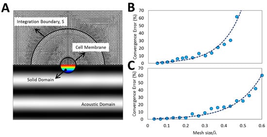 Mesh dependency analysis and convergence of finite element model (FEM) results. (A) Computational mesh structure for the acoustic solid interaction (ASI) model. An appropriate mesh size is selected based on the acoustic wavelength to comply with the gradients of deformation (color map inside solid domain) and acoustic pressure fields (gray-scale map of acoustic domain); (B,C) Convergence analysis of the ARF using Equation (9) for (B) ASI and (C) 2D model with proposed formulation (Equation (10)). For all simulations, a fine mesh (mesh size/λ = 1/15) was chosen to ensure the results accuracy. The graphs demonstrate that the proposed formulation has a better convergence with respect to the ASI model.