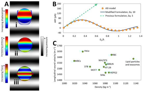 Analysis of the ARF exerted on the BP using ASI simulation. (A) Color map of displacement (i), internal pressure ((ii) , in which is the i-th principle stress in the solid domain), and time-averaged force on the elements within the BP (iii). The BP is placed in an acoustic standing pressure field (gray scale) with λ = Dp. In high frequencies, the elements located in various positions within the BP experience different displacements due to gradients of the pressure. Thus, the BP cannot be considered as a single point, and the resultant force over the whole BP volume needs to be calculated to obtain the ARF; (B) The comparison between the results of ASI model, proposed formulation (Equation (10)) in present work and previous formulations (Equation (5)). Results show a significant deviation of the ARF values in high frequencies between Equation (5) predictions and ASI results, however the proposed formulation (Equation (10)) is in a good accordance with the ASI model; (C) Density and longitudinal sound velocity of some BP materials [4,6,20,38,44,45]. Since deriving Equation (10) is based on the negligible difference in pressure map inside and outside the BP, the closeness of acoustic impedance of BP and surrounding fluid warrants a negligible error for the proposed formulation (see also Section 3.4).