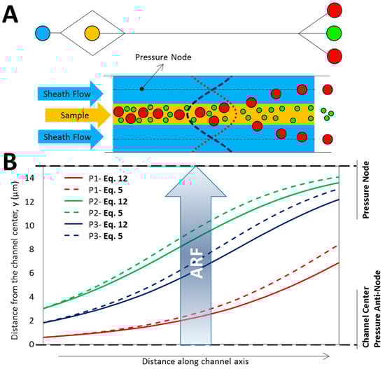 The primary application of acoustic-based manipulation is the separation of BPs in microdevices for upstream bioanalysis or purification of a fluid (Figure 4A) where high efficiency of the filtration is very important. Here, a one-directional acoustic field creates lines of acoustic pressure nodes/antinodes where BPs affected by the ARF aggregate based on their acoustic contrast factor. Figure 4B indicates the deviation of the BP trajectory based on the conventional formulation of ARF (dashed lines) compared to the evaluation of Equation (12). Since for the acoustic field with , the deviation of particle trajectory and consequently the error of separation efficiency is significant. It is noticeable that this deviation is even larger for higher frequencies as predicted by Equation (12) (Figure 3B).