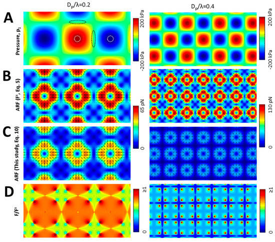 Evaluation of the ARF arising from perpendicular acoustic waves field with Dp/λ = 0.2 and 0.4. (A) Instantaneous acoustic standing pressure map. Ellipses between positive and negative pressure areas show typical pressure nodes while circles indicate typical pressure anti-nodes; (B) The ARF calculated using small particle assumption. Triangles show the force direction; (C) The calculated ARF where the BP size is considered in equations. The results demonstrate that not only the values of actual ARF are significantly lower in comparison with previous analytical approaches but also its pattern is different particularly in higher frequencies; (D) The deviation of previous ARF calculations with respect to the position in standing pressure field. The variable implies that cannot be amended by a constant modifying factor for multidirectional acoustic fields.
