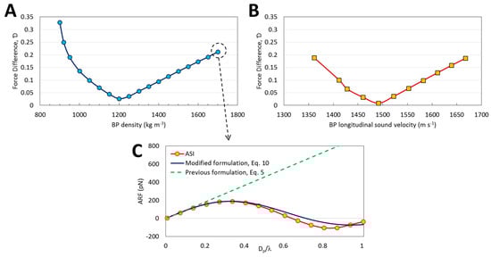 Investigation on the validity of Equation (10). The effect of (A) density and (B) longitudinal sound velocity of BPs on the force difference () in which the target force is the ARF calculated from Equation (10). The and are kept constant based on values in Table 1, respectively for (A,B); (C) The ARF obtained from ASI model compared to Equation (5) and Equation (10) predictions for 1700 kg m−3. Although the deviation of the BP density and longitudinal sound velocity from the optimal values shown in Figure 6A,B increases , the predictions are still acceptable compared to the results obtained from previous formulations that use the small particle assumption (Equation (5)).
