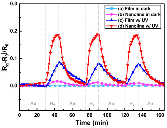 100 ppm H2 sensing response plot of (a) ZnO thin film in dark; (b) 400 nm wide ZnO line in dark; (c) ZnO thin film under ultraviolet (UV) light; and (d) 400 nm wide ZnO line under UV light. Reproduced with permission from [36].