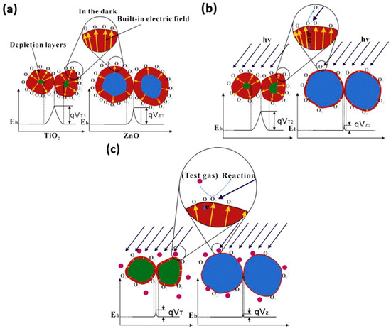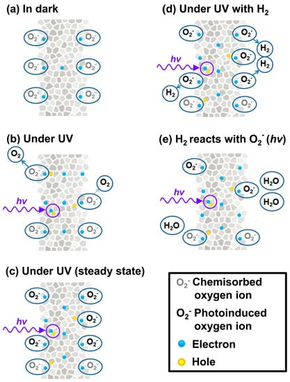 Diagram of the UV-activated room-temperature gas sensing mechanism.(a) In dark; (b) Under UV; (c) Under UV (steady state); (d) Under UV with H2; (e) H2 reacts with O2− (hv). Reproduced with permission from [36].