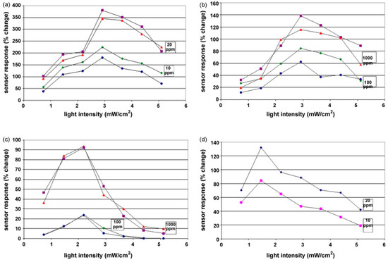 Sensing response (% change in the baseline current) vs. light intensity . Two different sensors based on ZnO were exposed to (a) hexane; (b) propane; (c) methane; (d) ethanol vapors of different concentrations. Reproduced with permission from [38].