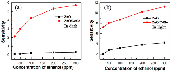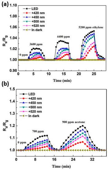 Sensing response of ZnO sensor to different concentrations of (a) ethylene and (b) acetone in air atmosphere in dark or under visible-light irradiation of different wavelengths. Reproduced with permission from [37].