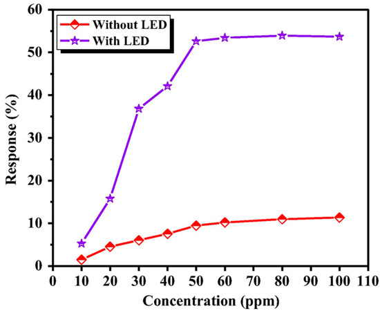 Response of ZnO with and without LED irradiation towards different concentration levels of hydrogen peroxide. Reproduced with permission from [42].
