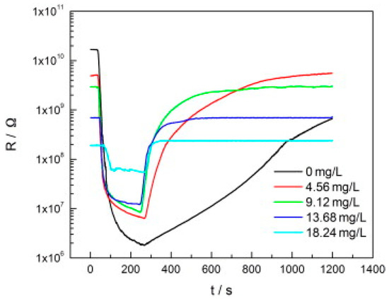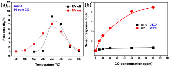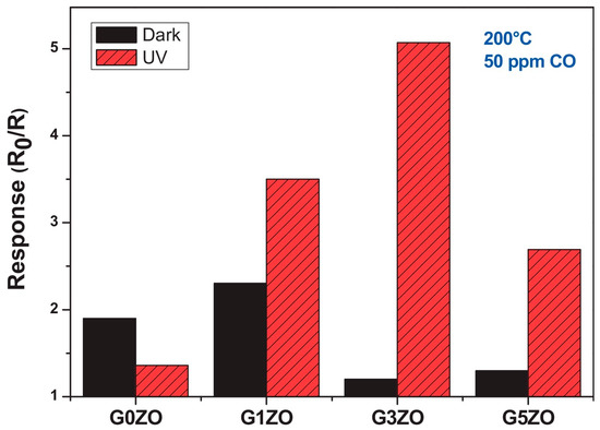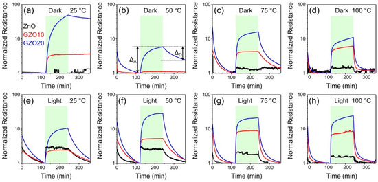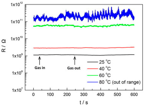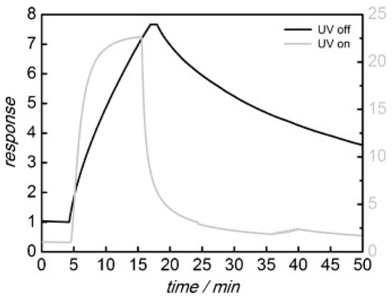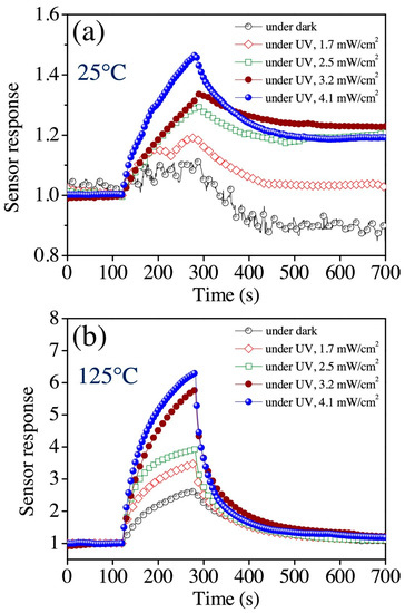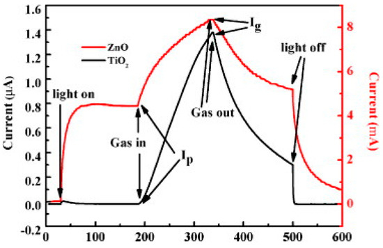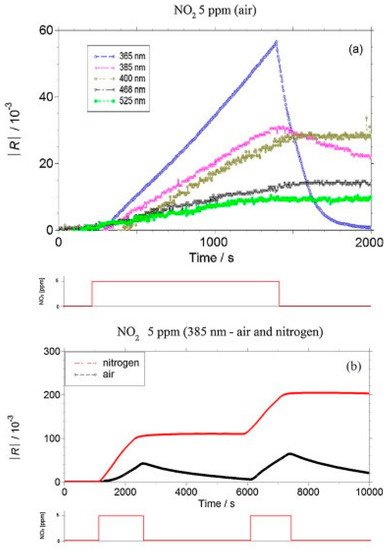 Consequent to the generation of oxygen ions, which governs the operation of conventional conductometric gas sensors based on metal oxide semiconductors, one typically needs to heat the sensing element to a working temperature of at least 150 °C [2,3,6]. The thermal activation of gas sensor causes several disadvantages [24]. A heating element should be added to the gas sensor head, which increases device complexity. High working temperatures also sacrifices device lifetime and long-term stability of sensing performance as this will result in regrowth of nanomaterials. It will also limit the sensor’s application in the detection of flammable or explosive analytes because of safety issues. Thus, an important research aim in the conductometric gas sensor is to lower the working temperature [24,30,31,32,33,34], Photon activation hence becomes an obvious choice.