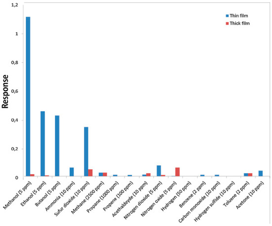 Comparison of sensing response towards various gas samples for the cases of thin and thick ZnO film. Reproduced with permission from [9].
