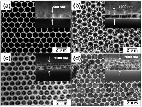 Field emission scanning electron microscopy (FESEM) images of ZnO porous thin film with different thicknesses on silicon wafer substrate, which was prepared by a layer-by-layer strategy based on solution-dipping of monolayer polystyrene (PS) template and transfer. (a) Monolayer; (b) Bilayer; (c) Trilayer; and (d) Tetralayer. The insets are the corresponding cross-sectional images. Reproduced with permission from [43].