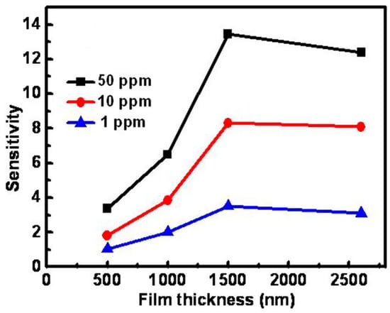 Compared to reductive gases, we found more research efforts on studying light-activated sensing of oxidizing gas by ZnO [9,42,43,44,45]. Parthasarathy used ZnO nanospheres to fabricate thin films for detecting H2O2 at room temperature in conditions with and without light illumination. The white LED enhanced sensing response by increasing carrier concentrations (Figure 5) [42]. Fabbri fabricated a ZnO thin film for NO2 sensing at room temperature with light illumination at different wavelengths as shown in Figure 6a, and found that the sensing response was wavelength dependent. Maximum response was activated by photons at 365 nm, which matched the bandgap energy of ZnO. The sensing performance was also influenced by the gas type as shown in Figure 6b. They reported that the NO2 sensing response is higher in N2 than in the air but irreversible in N2, this result was in agreement with the widely accepted sensing mechanism which involves oxygen adsorption and desorption. The sensing response towards various gas samples were compared using thin and thick ZnO films. The authors claimed that the thin film case exhibited higher response because the thick film sample had a layer thickness well beyond the light penetration depth (Figure 7) [9]. This film-thickness dependence was systematically studied by Su et al. through both experiments and theoretical calculation [43]. They fabricated ordered porous ZnO arrays with four different film thicknesses for NO2 sensing with UV illumination (Figure 8). The sensing response increased at first and then decreased with increasing film thickness (Figure 9). They theoretically calculated the light penetration depth (h) through analyzing the light intensity decay in the material. The optimal film thickness (H) at which the materials exhibited maximum sensing response should be equal to the light penetration depth. Their result was consistent with the optical absorbance spectra which showed that the absorbance intensity did not increase at 365 nm when the film was thicker than 1500 nm, which was the calculated penetration depth for 365 nm radiation in their ordered porous ZnO samples (Figure 10). The optimal film thickness was dependent on the material, the nanostructure and the wavelength of the incident light.