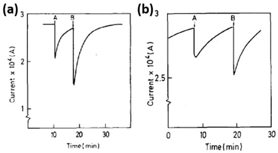Response of SnO2 towards vapors of acetone and trichloroethylene (a); trichloroethylene and acetone (b) under UV excitation. The short-wavelength cut-off of the excitation spectrum is at approximately 200 nm (a) and 230 nm (b). Reproduced with permission from [49].