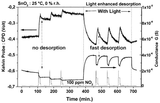 Gas response of SnO2 towards 100 ppm NO2 with and without illumination at 25 °C and 0% relative humidity. Conductance and contact potential difference (CPD) measurements are shown. Reproduced with permission from [50].